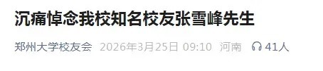 我校给排水工程专业校友张雪峰先生,因突发疾病经全力抢救无效,于2026年3月24日15时50分在苏州不幸逝世,年仅41岁。郑州大学校友会对张雪峰校友的离世表示深切哀悼,向其家属致以最诚挚的慰问。