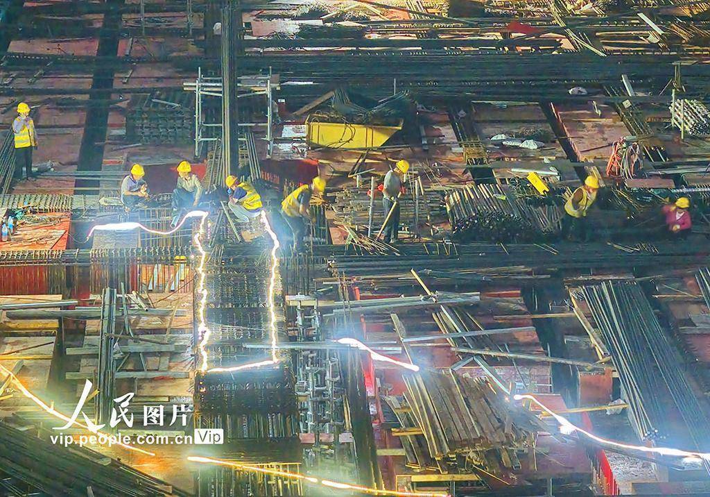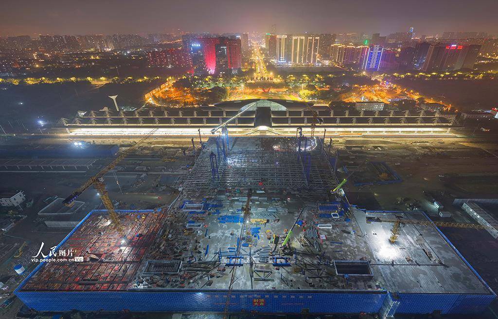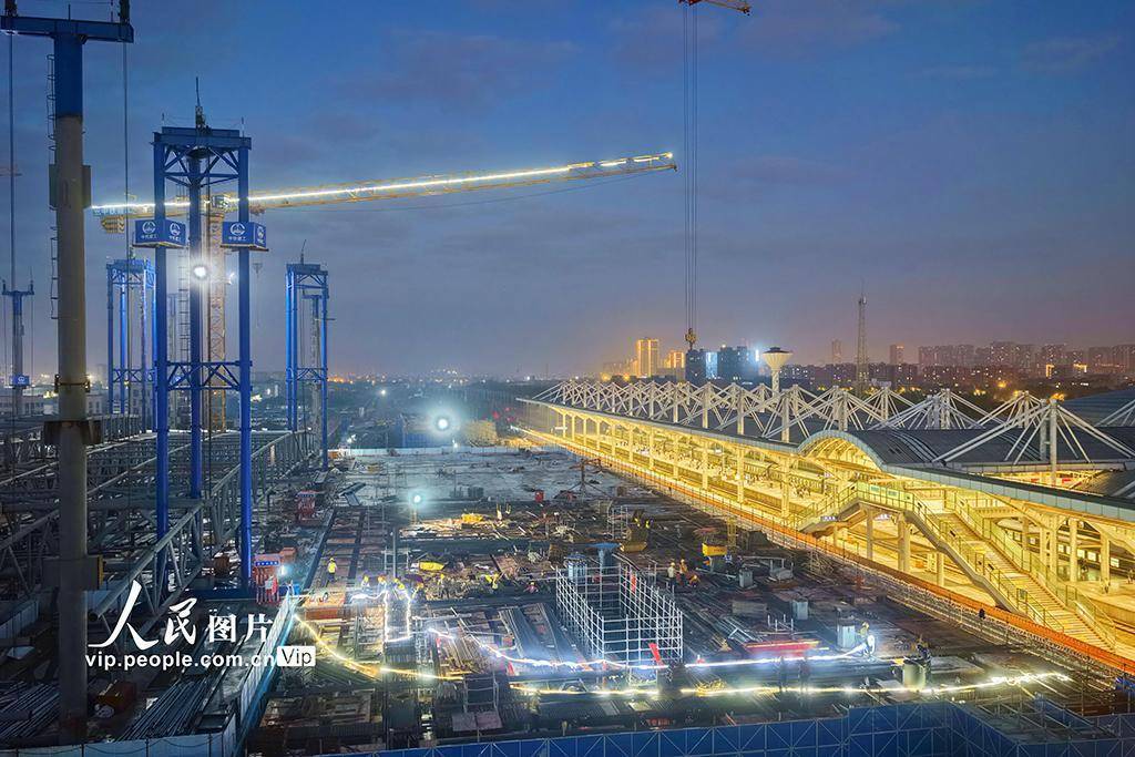 2025年9月30日晚,江苏南通,新建上海至南京至合肥高速铁路南通站站房建设正有序推进。