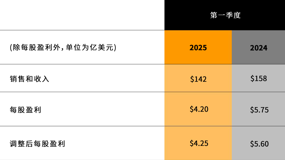 2025年第一季度营业利润率为18.1%,而2024年第一季度为22.3%。2025年第一季度调整后营业利润率为18.3%,而2024年第一季度为22.2%。2025年第一季度每股盈利为4.20美元,而2024年第一季度每股盈利为5.75美元。2025年第一季度调整后每股盈利为4.25美元,而2024年第一季度调整后每股盈利为5.60美元。2025年第一季度和2024年第一季度,调整后营业利润率和调整后每股盈利均不包括重组收入/成本。